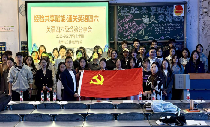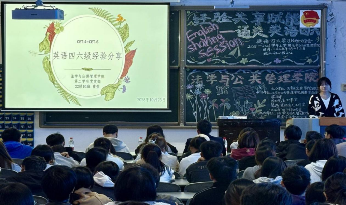 为切实提升学生英语四六级备考能力,推进“知行合一,‘英’为有你”特色支部建设,10月23日,法管学院党委于初心楼202教室举办英语四六级经验分享会。本次经验分享会由学生党员曹莹主讲,参与人员有第一、第二、第三学生党支部书记李成龙、谢明聪、王馨,以及50名学生党员。