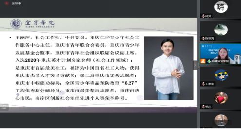 随后,重庆仁怀社工主任王丽萍发言。她分享了重庆及仁怀社工的发展状况,通过带入青春最鲜亮的底色,讲述她作为社工的生命历程,并展示了宜宾学院学生参与一线社工的服务过程。她强调,不仅要践行社工助人自助的服务理念,也要彰显社会工作的专业价值,作为社工的我们更要关心他人关爱自己。最后,她引用习近平主席的话“展望未来,我国青年一代必将大有可为,也必将大有作为,广大青年要充分展现自己的抱负和激情,胸怀理想、锤炼品格,脚踏实地、艰苦奋斗,不断书写奉献青春的时代篇章”作为对同学的期许。