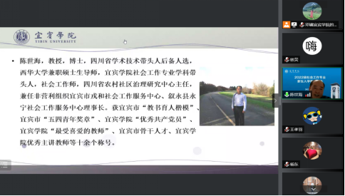 2022年9月16日19时,2022级社会工作专业新生入学教育大会于线上举行。社会工作专业学科带头人陈世海教授、重庆仁怀青少年社会工作服务中心主任王丽萍、湖北省德善公益基金会秘书长张敏等出席本次社会工作专业新生入学教育大会,社工教研室全体老师以及95名新生线上参加。