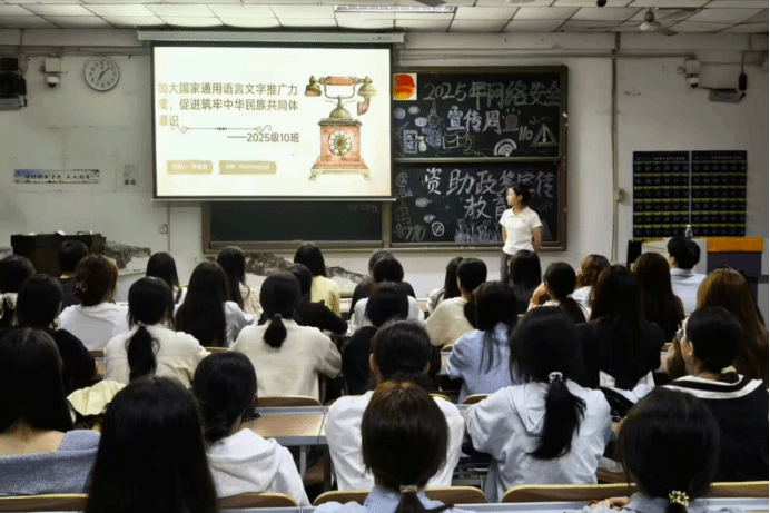为营造推普氛围,法管学院于宣传栏规范张贴宣传海报,以可视化宣传的形式推动同学们形成自觉使用普通话的习惯。9月21日,各班组织开展主题班会,各班班长围绕班会主题从语言规范和民族交融两方面强调要以“语言相通”促进思想相融,引导大家在规范语言交流中深化对中华民族共同体的认同,凝聚“中华民族一家亲,同心共筑中国梦”的强大合力。