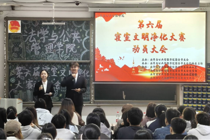 寝风沐暖,文明同行。此次动员大会深度呼应了《关于加强高校学生宿舍建设的指导意见》,为寝室文明大赛拉开了序幕,进一步明确了活动目标和要求,有效调动了学生参与的热情,为后续打造文明、温馨的宿舍环境奠定了基础。未来,法管学院将继续秉持“自强不息,至善致远”的学院精神,营造和谐融洽、积极向上的寝室文化,让文明之风贯穿校园生活,助力学生全面发展。