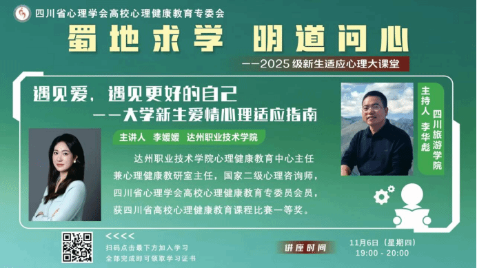 为帮助2025级新生(含专升本学生)更好地适应大学生活、掌握心理健康知识、提升心理素养,四川省心理学会高校心理健康教育专委会特举办“蜀地求学,明道问心——2025级大学新生适应大课堂”。其中第六场课程《遇见爱,遇见更好的自己——大学新生爱情心理适应指南》已于11月6日上线,每节课程回放仅保留7天。