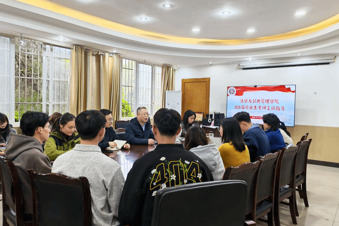 为帮助考研学子提升复试能力,调整应试心态,掌握答题技巧,全力冲刺理想院校,3月27日,法管学院于A区初心楼116教室开展2026届毕业生考研复试指导活动。法管学院副院长(主持工作)刘廷华,党委副书记、纪委书记罗春,学生工作办公室教师及学业导师冷宇晴、汪梦晗、蒋凌、李瑞、刘垚参与本次考研复试指导活动。