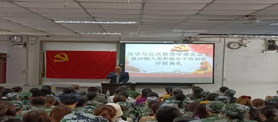 2020年11月10日下午12:50,法学与公共管理学部于一教104举行第39期入党积极分子培训班开班典礼。法学与公共管理学部党总支书记刘廷华、正处级组织员蒲东升,党总支副书记单琰秋、张波,第一学生党支部书记寇杪,第二学生党支部书记王燕和第三学生党支部书记王馨出席本次典礼,学部170名入党积极分子培训班学员参加本次典礼,本次典礼由党总支副书记单琰秋主持。