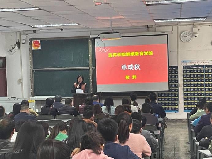 单琰秋代表宜宾学院继续教育学院致辞,她讲到,宜宾学院继续教育学院与宜宾市委组织部共建的基层干部学历提升工程已成功培养了近4000名基层干部,他们分布在宜宾市的各个角落,为乡村振兴战略的实施贡献着自己的力量。法管学部作为基层干部学历提升班的主要培养单位,不断强化教学管理,治学严谨,创新教育教学模式,与继续教育学院共同实践 “党建引领+创新教学方式+协同三方管理+稳定多元师资+开发课程资源”的五位一体继续教育教学模式。她鼓励大家以责任感和使命感引领学习,注重提升实践能力和创新思维,锤炼品德修养和职业素养,珍惜这次学习机会,努力提升自己,为乡村振兴和地方治理贡献自己的力量。