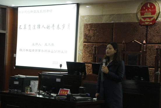 王凤英教授系四川丰宜律师事务所屏山分所主任,从事法律工作多年,有着丰富的司法实践经验和指导法学实习生的经验。在讲堂过程中,王教授就学生初入实习阶段及后期实习阶段易犯错误进行详细分析,并对同学们在实习中“能做与不能做”做了专业指点。同时,以专业法律人的角度给大家讲解了法律与时代发展的关系,列举优秀人物事迹劝勉同学们要树立终生学习的信念,在大学期间要把碎片化的时间利用起来并借助各种学习平台拓展学识。最后,王教授鼓励大家,在学习的过程中任何时候学习都不晚,做好职业规划,结合自己的学识与爱好,定下目标,坚持下去,不忘初心,不负时光和岁月,定会收获颇丰。