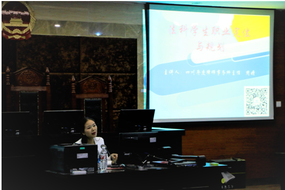 为了让学生有一个清晰的学习和职业规划,提高学生的社会认知能力,4月22日晚七点半,四川舟度律师事务所主任周婧律师受邀为我院学生做主题为“法科学生职业定位与规划”的讲座。讲座在我院模拟法庭举行,法学院党总支蒲东升书记主持讲座,我院16、17级法学专业学生全程聆听讲座并作询问交流。