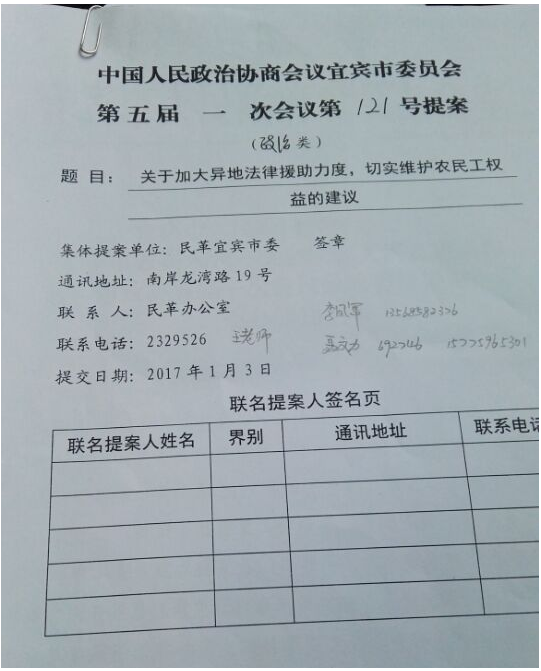2017年1月20日法学院聂文力同学负责的《异地法律援助在农民工维权工作中的实践与创新》(小组其他成员: 冉琪琦,李倩,付贵红,李凤军指导)课题成功转化宜宾市政协议案,该议案由宜宾市司法局负责承办解答。(中国人民政治协商会议宜宾市委员会第五届第一次会议第121号议案)