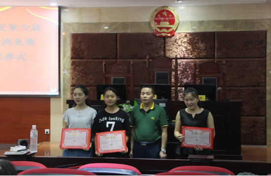经过一番紧张角逐,六月七号下午,模拟法庭竞赛颁奖仪式在模拟法庭举行,荣获非专业组冠军的是体育学院刘婷婷、李芋积 、李珍、胡霞涛;荣获亚军的是文新学院达则果果、张露瑶、胡林容、牟燕;荣获季军的是化工学院李彦沅、魏溢、范富强、陈览瑶。优秀辩手分别为胡霞涛、达则果果、范富强。