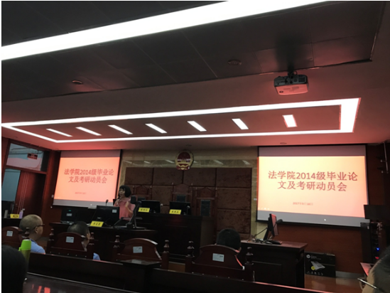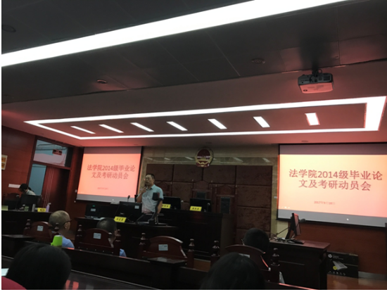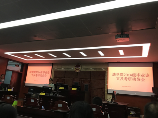 为了顺利推进2014级法学及知识产权专业学生毕业论文撰写工作,确保以上同学保质保量完成毕业论文撰写任务,顺利毕业;同时也为了给同学们考研指明方向,提供指导和帮助,帮助其考取理想院校,9月18日晚7点,法学院相关领导老师于一教模拟法庭实验室组织召开了2014级毕业论文及考研动员会,对相关工作做出了安排部署。