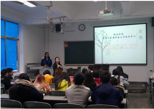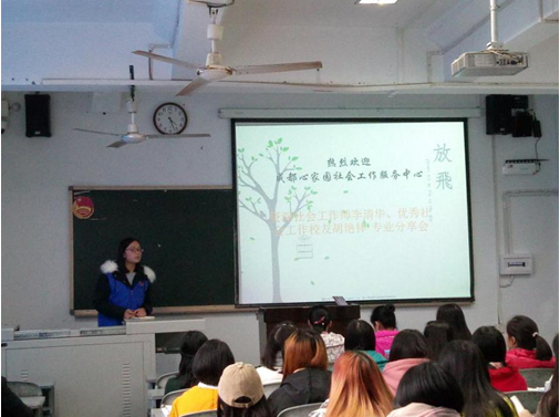 2017年11月29日上午10:00,社会工作专业分享会在一教208举行。在这次交流会上,成都心家园社会工作者服务中心资深社会工作师李清华、优秀社会工作校友胡艳林进行专业实践分享,陈世海、张义烈、龙玲、杨东、黄春梅等老师均参加了此次专业分享会。