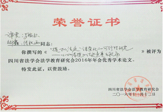 本次年会的主题是“法学专业应用型人才培养与实践性教学改革”,组委会围绕会议主题面向全国征集了论文,实际收到论文20余篇,从中评选了7篇论文作为本次年会的优秀学术论文。由邓中文教授指导的2016年省级大学生创新创业项目《“模拟法庭”课堂化的可行性研究——以四川省模拟法庭竞赛为视角》(项目组成员为:谭雯、罗榆钦、卿鑫、张秋雨)形成的成果论文荣获年会优秀学术论文,进一步扩大了我院在省内法学院校中的影响力。