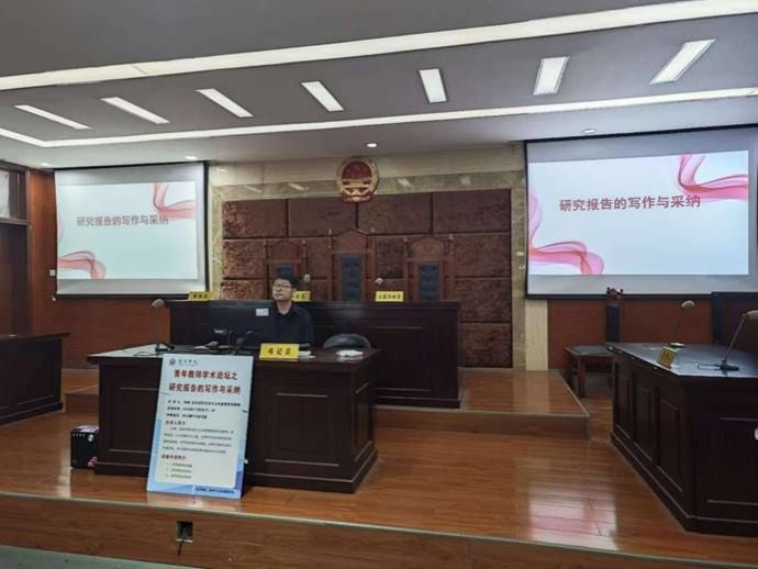 2024年11月6日下午,法学与公共管理学院在模拟法庭实验室开展青年教师学术论坛,本次论坛由刘峰老师进行“研究报告的写作与采纳”主题分享,学院青年教师参与本次论坛。