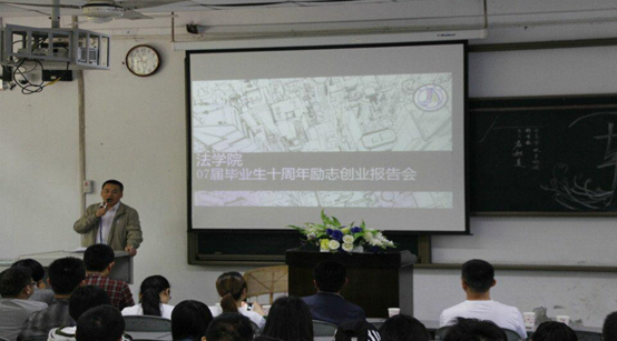 上午九点,受邀07届杰出校友钟诚等在一教101教室作题为“07届毕业生十周年励志创业报告会”。本次报告会由法学院党总支副书记张波主持,法学院相关领导及07届法学院老师出席了本次报告会,法学院在校部分学生积极参加了本次报告会,现场气氛十分热烈。